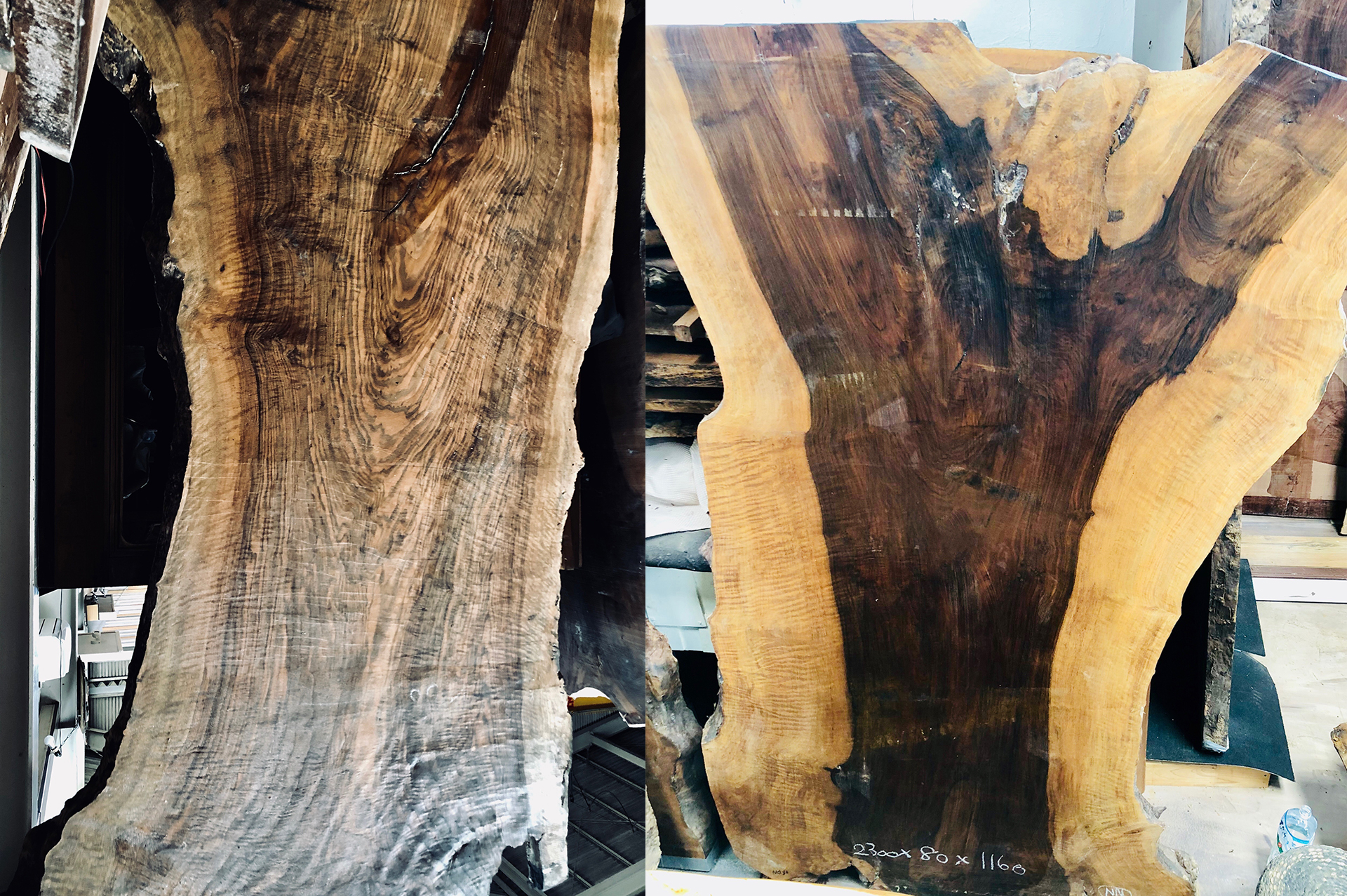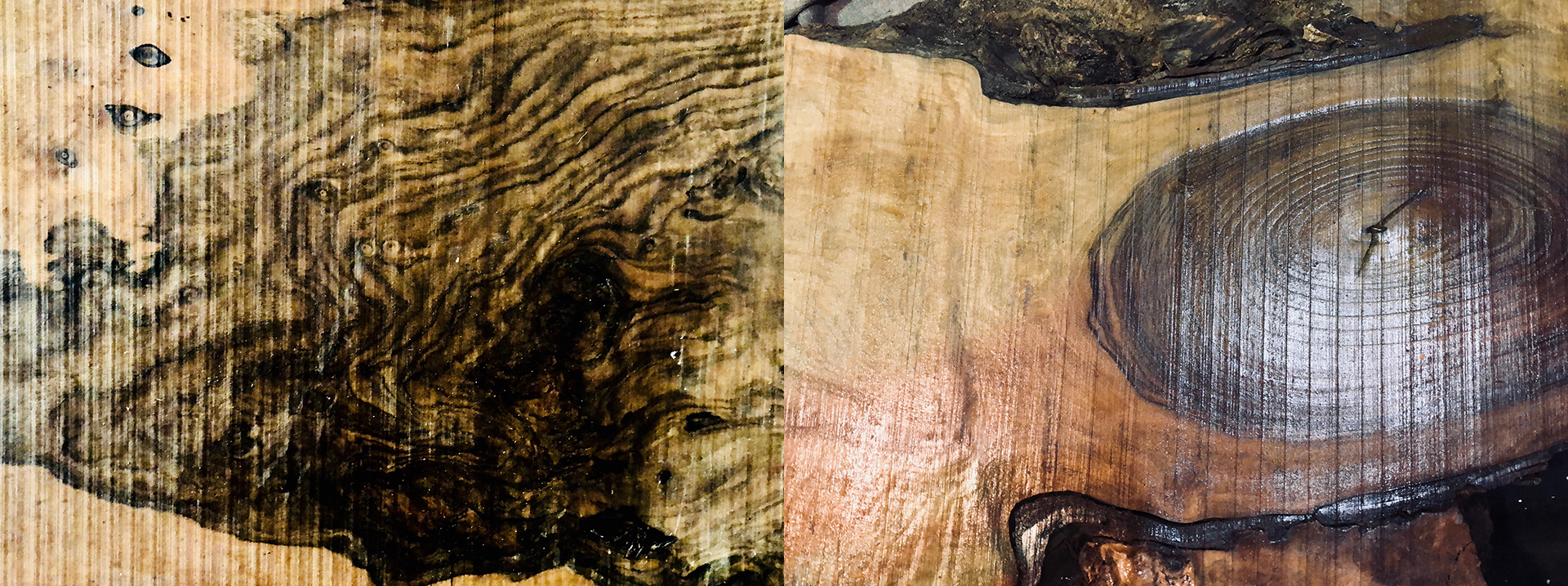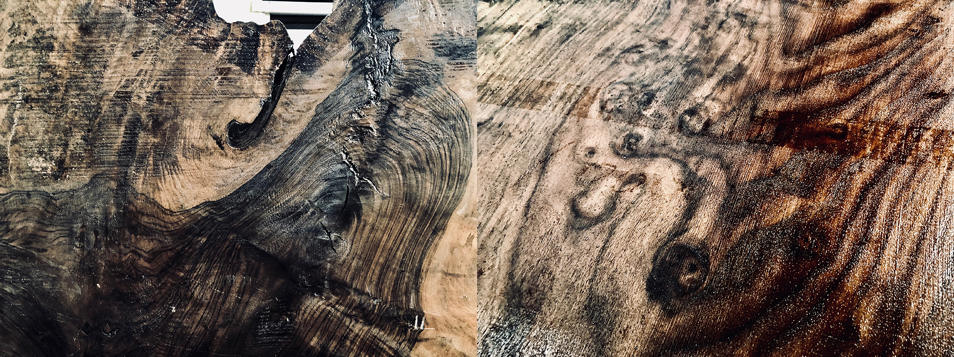 クラロウォールナットにもバストゥーンウォールナットにも、接ぎ木部分にうねり杢目があります。