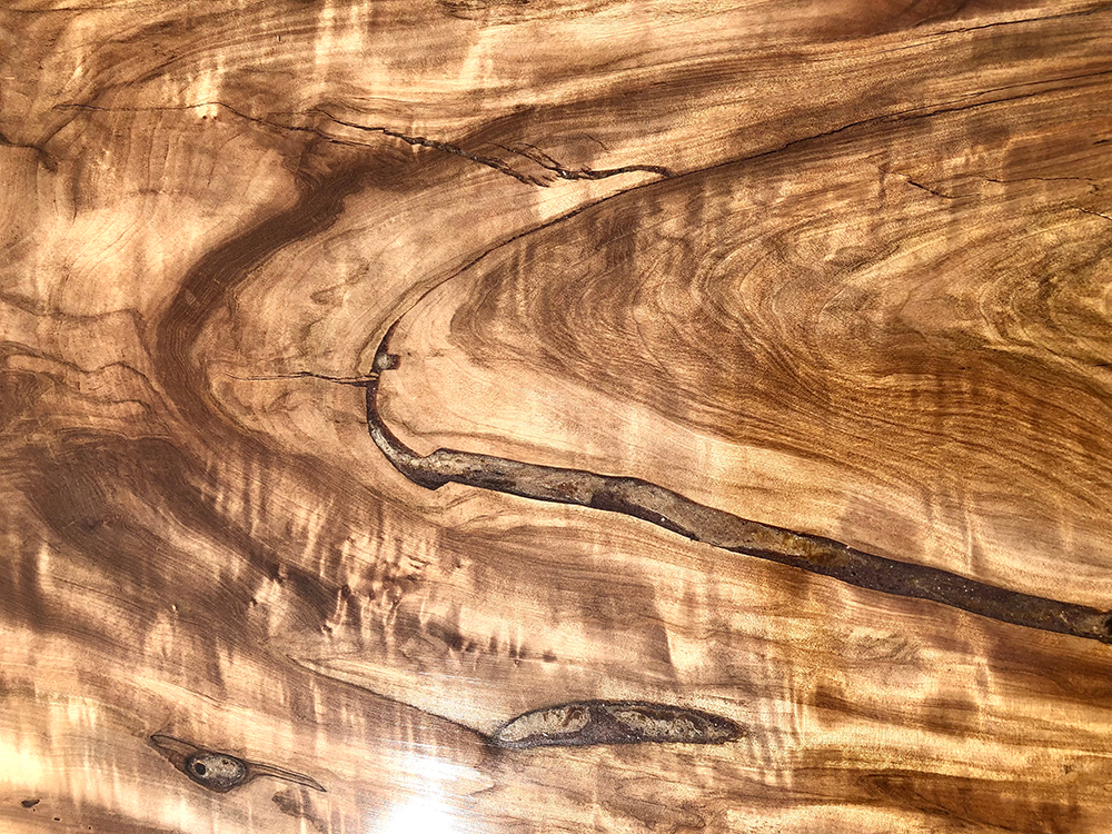 迫力の大判の栃。キラキラで美しいですが、入皮部分があることとパテ埋めがあるため少しお安くなってます。2300mmの長さで切らせていただくと割れの部分(パテ埋めの部分)がなくなります。無料でカットさせていただきます。